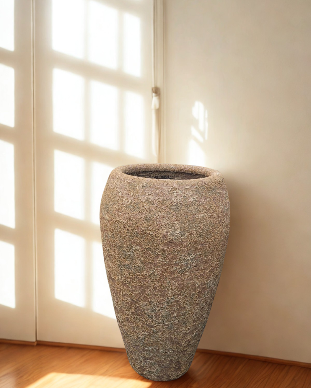 Design elegante e contemporâneo com um perfil inspirado no estilo vietnamita: a linha Mediterrâneo, modelo Vesúvio, é uma coleção de vasos que se destaca por sua textura, que garante uma aparência semelhante à de pedras, remetendo a corais e parecendo ter saído do fundo do mar. Isso confere um toque rústico e orgânico à peça.