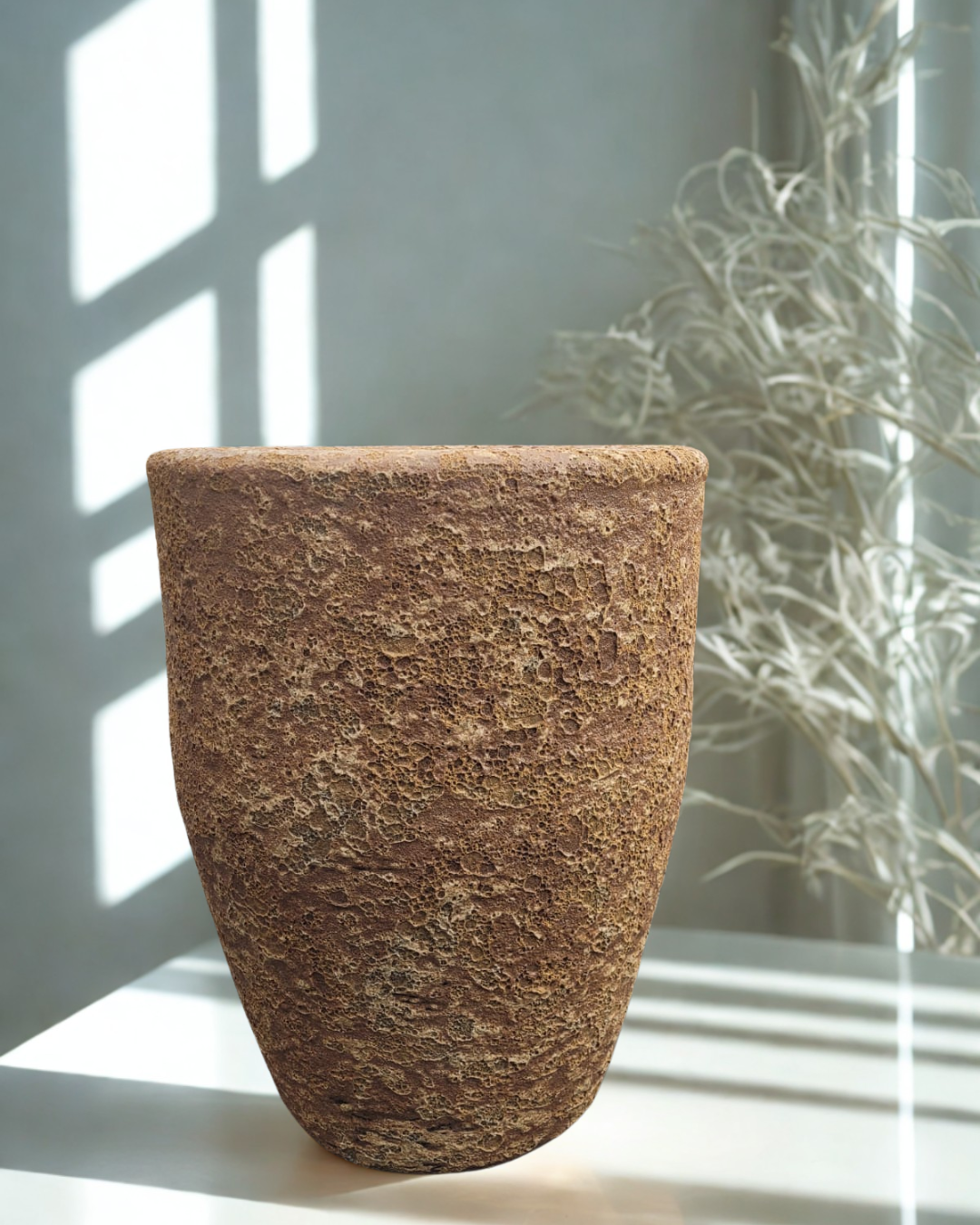 Design elegante e contemporâneo com um perfil inspirado no estilo vietnamita: a linha Mediterrâneo, modelo Vesúvio, é uma coleção de vasos que se destaca por sua textura, que garante uma aparência semelhante à de pedras, remetendo a corais e parecendo ter saído do fundo do mar. Isso confere um toque rústico e orgânico à peça.